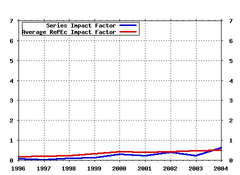 The British Household Panel Survey (2002). Department of Economics, University of Leicester / Discussion Papers in Economics (5) RePEc:pra:mprapa:4478 The slowdown in first-response times of economics journals: Can it be beneficial? (2002). University Library of Munich, Germany / MPRA Paper (6) RePEc:wiw:wiwrsa:ersa02p142 Entrepreneurial attitude and economic growth; a cross-section of 54 regions (2002). European Regional Science Association / ERSA conference papers (7) RePEc:wpa:wuwpif:0207001 The Contribution of the IMF and the World Bank to Economic Freedom (2002). EconWPA / International Finance (8) RePEc:zbw:zewdip:879 The Contribution of the IMF and the World Bank to Economic Freedom (2002). ZEW - Zentrum für Europäische Wirtschaftsforschung / Center for European Economic Research / ZEW Discussion Papers Latest citations received in: 2001 (1) RePEc:hit:hituec:a417 Introduction Hondbook of Social Choice and Welfare Edited by Kenneth Arrow, Amartya Sen and Kotaro Suzumura Amsterdam: Elsevier/North-Holland (2001). Institute of Economic Research, Hitotsubashi University / Discussion Paper Series Warning!! This is still an experimental service. The results of this service should be interpreted with care, especially in research assessment exercises. The processing of documents is automatic. There still are errors and omissions in the identification of references. We are working to improve the software to increase the accuracy of the results. Source data used to compute the impact factor of RePEc series.