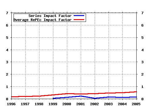 IF: Impact Factor: C2Y / D2Y AIF: Average Impact Factor for series in RePEc in year y DOC: Number of documents published in year y CIT: Number of citations to the series in year y D2Y: Number of articles published in y-1 plus y-2 C2Y: Cites in y to articles published in y-1 plus y-2 SC(%): Percentage of selft citations in y to articles published in y-1 plus y-2 CiY: Cites in year y to documents published in year y IdI: Immediacy Index: CiY / Documents.   AII: Average Immediacy Index for series in RePEc in year y