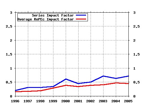 Cross-Sectional Dependency and Heterogeneity (2002). International Conferences on Panel Data / 10th International Conference on Panel Data, Berlin, July 5-6, 2002 (2) RePEc:cwl:cwldpp:1363 Efficient Regression in Time Series Partial Linear Models (2002). Cowles Foundation, Yale University / Cowles Foundation Discussion Papers (3) RePEc:cwl:cwldpp:1385 From Efficient Market Theory to Behavioral Finance (2002). Cowles Foundation, Yale University / Cowles Foundation Discussion Papers (4) RePEc:fda:fdaddt:2002-24 Assessing Self-Assessed Health Data (2002). FEDEA / Working Papers (5) RePEc:mtl:montec:18-2002 Testing for a Unit Root in Panels with Dynamic Factors (2002). Centre interuniversitaire de recherche en économie quantitative, CIREQ / Cahiers de recherche (6) RePEc:nbr:nberte:0287 Cointegration Vector Estimation by Panel DOLS and Long-Run Money Demand (2002). National Bureau of Economic Research, Inc / NBER Technical Working Papers (7) RePEc:nbr:nberwo:9351 Pharmaceutical-embodied technical progress, longevity, and quality of life: drugs as equipment for your health (2002). National Bureau of Economic Research, Inc / NBER Working Papers (8) RePEc:nzb:nzbdps:2002/03 Monetary policy and forecasting inflation with and without the output gap (2002). Reserve Bank of New Zealand / Reserve Bank of New Zealand Discussion Paper Series Warning!! This is still an experimental service. The results of this service should be interpreted with care, especially in research assessment exercises. The processing of documents is automatic. There still are errors and omissions in the identification of references. We are working to improve the software to increase the accuracy of the results. Source data used to compute the impact factor of RePEc series.