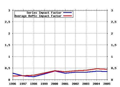 Assessment of the Church Tower Principle (2002). Sveriges Riksbank (Central Bank of Sweden) / Working Paper Series (26) RePEc:iza:izadps:dp554 Employment Protection, Product Market Competition and Growth (2002). Institute for the Study of Labor (IZA) / IZA Discussion Papers (27) RePEc:tcd:tcduee:200214 The New Open Economy Macroeconomics of Government Debt (2002). Trinity College Dublin, Department of Economics / Trinity Economics Papers (28) RePEc:usg:dp2002:2002-29 The Rise and Fall of Swiss Unemployment - Relative Demand Shocks, Wage Rigidities, and Temporary Immigrants (2002). Department of Economics, University of St. Gallen / University of St. Gallen Department of Economics working paper series 2002 Warning!! This is still an experimental service. The results of this service should be interpreted with care, especially in research assessment exercises. The processing of documents is automatic. There still are errors and omissions in the identification of references. We are working to improve the software to increase the accuracy of the results. Source data used to compute the impact factor of RePEc series.