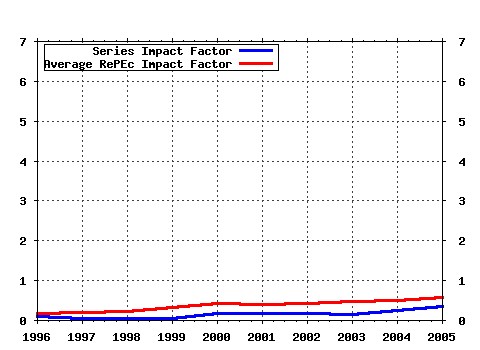 with democracy in Western Europe (2003). Department of Economics, Johannes Kepler University Linz, Austria / Economics working papers (3) RePEc:jku:econwp:2003_04 Tradeable permits - Ten key design issues (2003). Department of Economics, Johannes Kepler University Linz, Austria / Economics working papers Latest citations received in: 2002 (1) RePEc:bro:econwp:2002-09 Basic Skills and the Earnings of Dropouts (2002). Brown University, Department of Economics / Working Papers (2) RePEc:dgr:umamer:2002041 The Impact of education and mismatch on wages: Germany, 1984-2000 (2002). Maastricht : MERIT, Maastricht Economic Research Institute on Innovation and Technology / Research Memoranda Warning!! This is still an experimental service. The results of this service should be interpreted with care, especially in research assessment exercises. The processing of documents is automatic. There still are errors and omissions in the identification of references. We are working to improve the software to increase the accuracy of the results. Source data used to compute the impact factor of RePEc series.